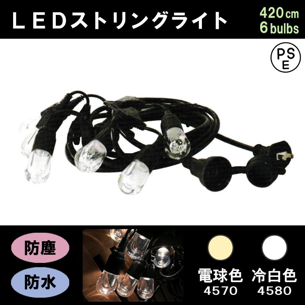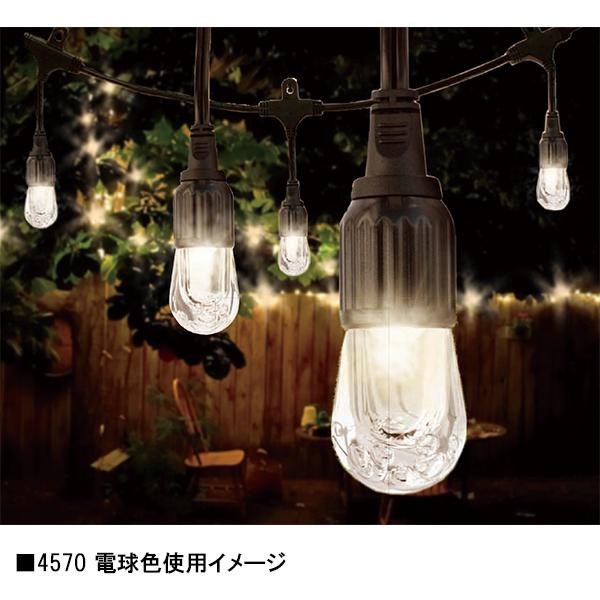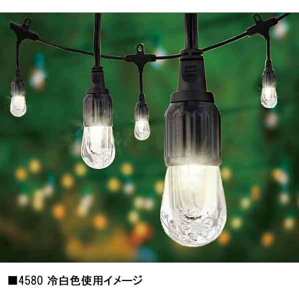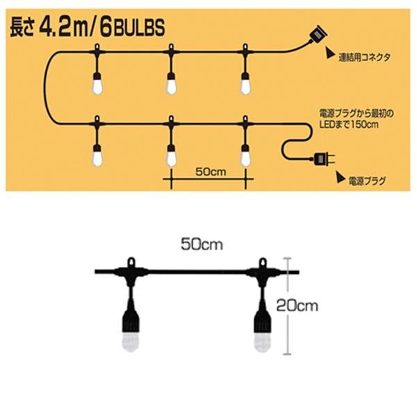 | 仕様 | 定格電圧:AC100V 定格周波数:50/60Hz 定格入力電流:0.05A 定格消費電力:5W 明るさ(バルブ1個あたり):80ルーメン 使用光源:高輝度拡散型LED 色温度2700K(電球色)/5000K(冷白色) 防水・防塵性能:IP54 LED寿命:約50000時間 電源プラグコード長さ:電源プラグから最初のLEDまで150cm バルブ(LED)ピッチ:500mm 使用場所:屋外、屋内 |