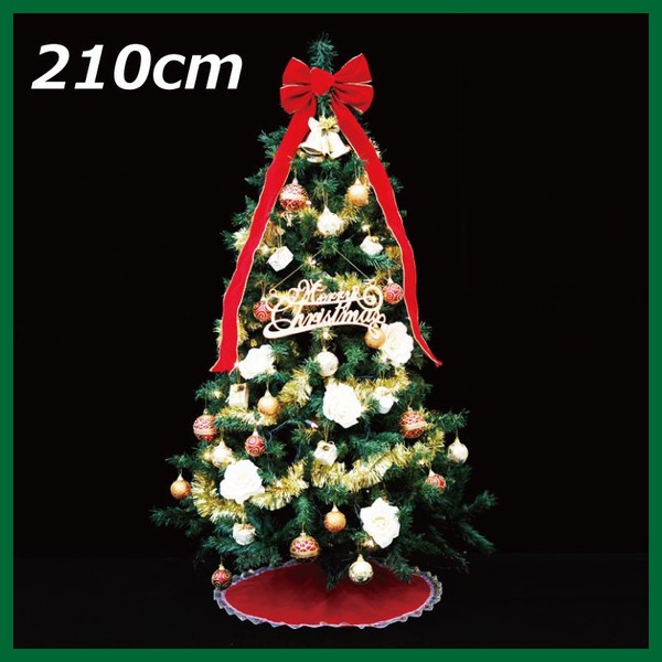 クリスマスツリー サイズ  直径137cm×高さ210cm梱包数  1個口外 箱  42cm×19cm×107cm             (セット明細)・210cmスレンダーツリー(1)・4インチ×2.7mマットモール(4)・70mmアミメグリッターボール(8)・60mmマットボール(24)・70mmボール(12)・2.5インチペーパーBOX(12)・12インチMCプレート(1)・9.5インチトップリボン(1)・3インチツインレリーフベル(1)・7インチエンボストップスター(1)・4インチチャーミングローズ(10)・90cmベルベットツリースカート(1)・クリアライト200球(1)スレンダーツリーに豪華なオーナメントをつけたツリー収納もコンパクトに収まるので人気のクリスマスツリーです。