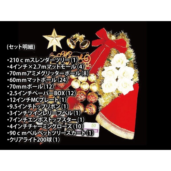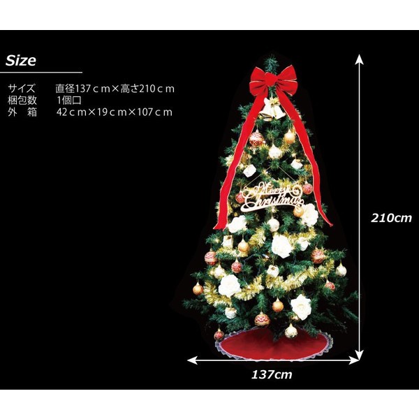 サイズ  直径137cm×高さ210cm梱包数  1個口外 箱  42cm×19cm×107cm             (セット明細)・210cmスレンダーツリー(1)・4インチ×2.7mマットモール(4)・70mmアミメグリッターボール(8)・60mmマットボール(24)・70mmボール(12)・2.5インチペーパーBOX(12)・12インチMCプレート(1)・9.5インチトップリボン(1)・3インチツインレリーフベル(1)・7インチエンボストップスター(1)・4インチチャーミングローズ(10)・90cmベルベットツリースカート(1)・クリアライト200球(1)スレンダーツリーに豪華なオーナメントをつけたツリー収納もコンパクトに収まるので人気のクリスマスツリーです。