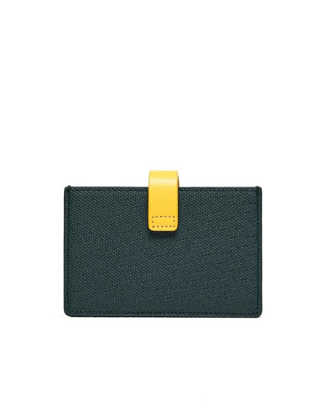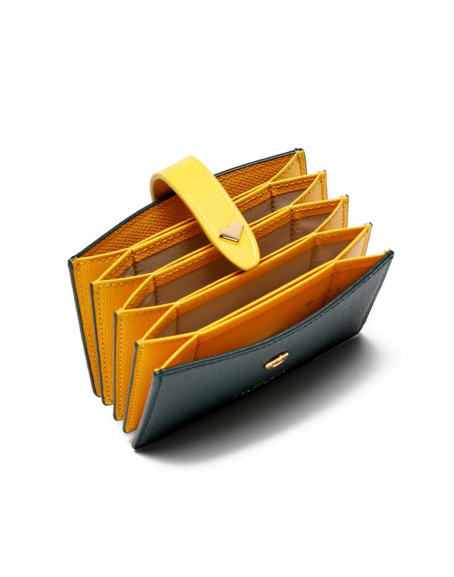 고급스러운 다크그린 소가죽 바탕에 옐로우 배색과 골드 하트 장식으로 포인트를 준 아코디언 카드지갑입니다.