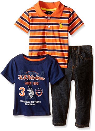 -. Binding : Apparel -. Brand : U.S. Polo Assn. -. Department : baby-boys -. Feature : Rib knit collar and cuffs on polo shirt / Screen P.R.Int logo t-shirt / 5 pocket denim jean / Buttons and hardware logo embossed / Zip fly -. Label : US Polo Assn. Children's Apparel -. Manufacturer : US Polo Assn. Children's Apparel -. Model : HX001 -. PackageQuantity : 1 -. ProductGroup : Apparel -. ProductTypeName : PANTS -. Publisher : US Polo Assn. Children's Apparel -. Studio : US Polo Assn. Children's Apparel -. Title : U.S. Polo Assn. Baby Boys' Striped Polo, Graphic T-Shirt, and Denim Jean Set