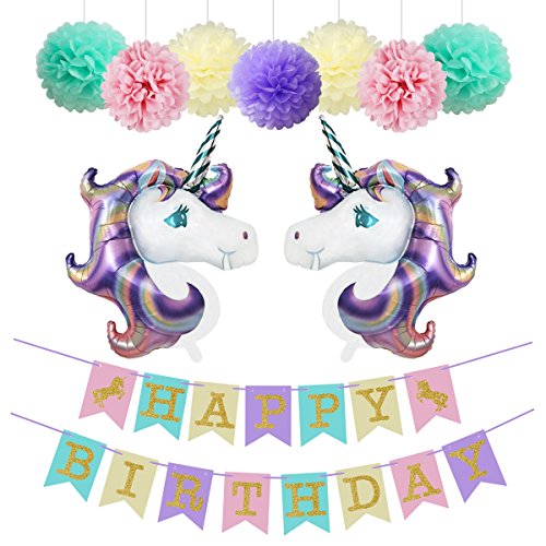 Product Detail:? * Brand:Hicet * Material:Soft felt cloth,tissue paper pom poms,foil balloons * Package Dimenstions: 11.4" x 7.5" x1.18' * Paper Pom Poms Color:Beige,tiffany,pink,purple * Happy Birthday Banner Color:Beige,tiffany,pink,purple,golden glitter letters * Balloons Color:Lavender * Package Quantity:7 Pcs tissue paper pom poms,13 Pcs happy birthday letters,2 Pcs lavender unicorn balloons,1 long purple string,a plastic needle,plus a roll of ribbon