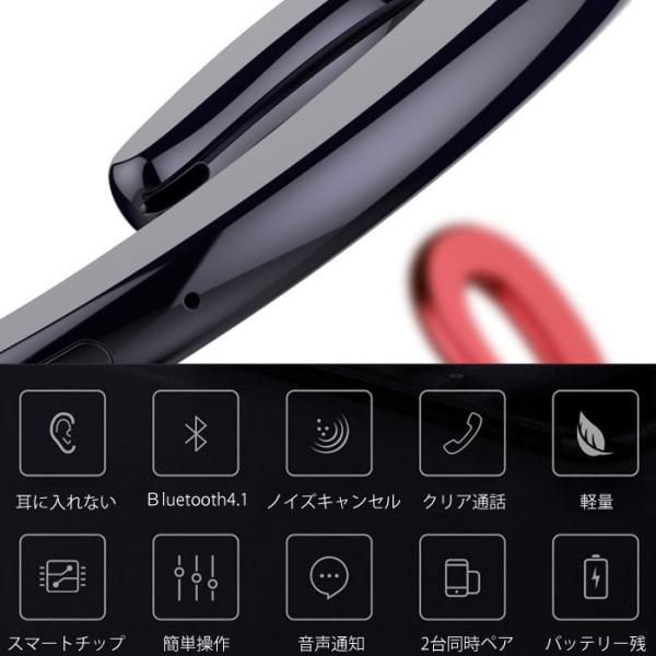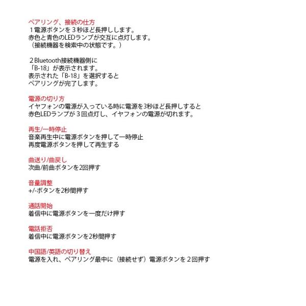 サイズ:71.9mm*343.6mm*7mm重量:8gBluetoothバージョン:V4.1Bluetoothの伝送距離:約10M通話時間:5-6時間音楽プレーヤー:4-5時間スタンバイ時間:120-150時間バッテリー容量:3.7V/90mAh充電時間:1-2時間充電インターフェース:Micro-USBペアリング、接続の仕方1電源ボタンを3秒ほど長押しします。赤色と青色のLEDランプが交互に点灯します。(接続機器を検索中の状態です。)2Bluetooth接続機器側に「B-18」が表示されます。表示された「B-18」を選択するとペアリングが完了します。商品は耳を塞がずブルートゥース イヤホンです、骨伝導イヤホンではありません。耳の骨を振動させる必要はなく、骨伝導ヘッドフォンより快適し健康です。耳の近くから内耳に微細な振動を伝えることで音声を伝達します。耳を開放しておくことのメリットとしては、音を聞きながら耳から入ってくる音も聞き取ることが出来るため、ジョギングや歩行中でも安心して音楽や通話を楽しむことが出来ます。