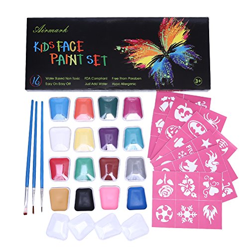 Face Painting Kit for Kids, Airmark 16 Colored Professional Body Paint set with 36 Stencils and 3 Brushes,Best Party Palette Kits Non-Toxic,FDA Approved