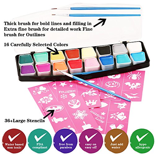 - UPGRADE FACE PAINTING SET:16 colored new set and 36 Stencils & 3 Brushes,Upgrade version is more favorable than other brands.