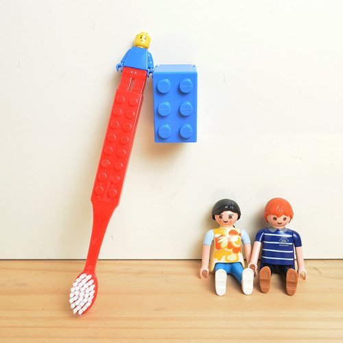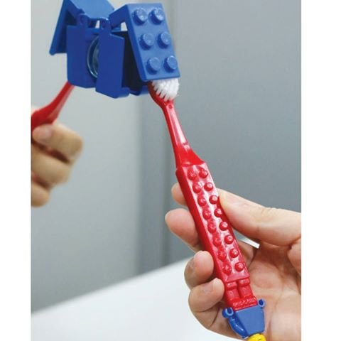 Kids Children Antibacterial Toothbrush Brick Design Toothbrush Brick Holder Case Cover (RedBrickBrush-BlueHolder)