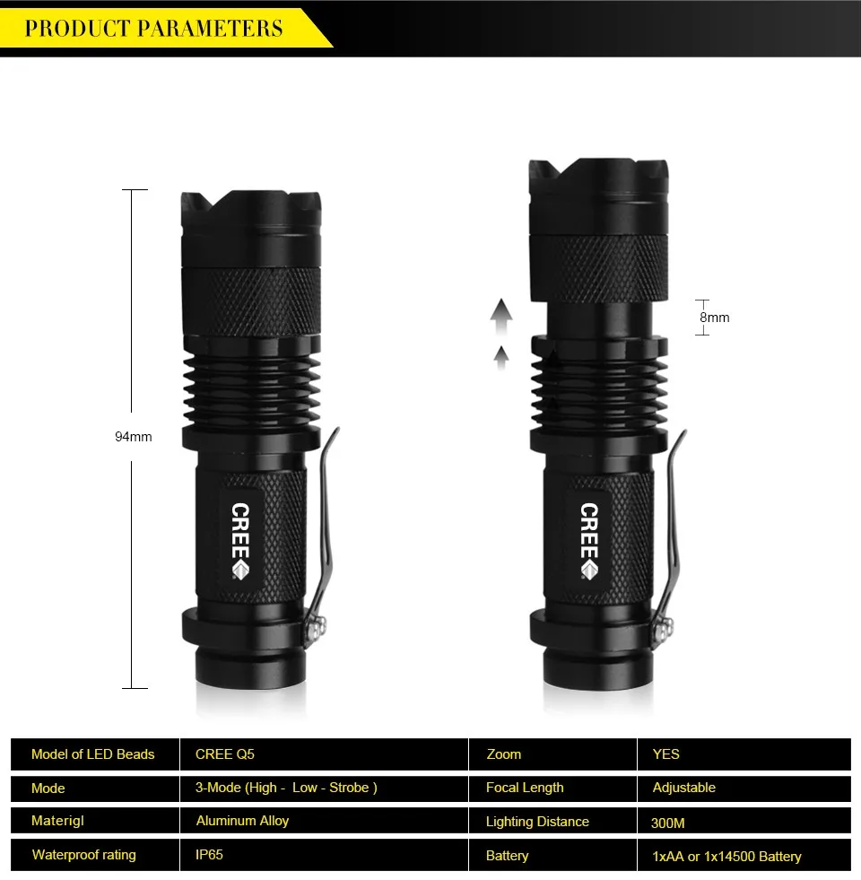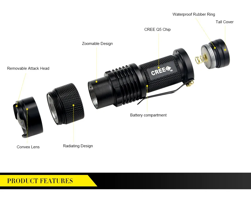 1. The body of this flashlight is built of high quality aluminum alloy, and it has a very solid construction