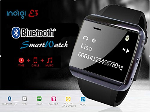 -. Feature : Discover Indigi E3 Smart Watch, a sleek and minimalist smartwatch that brings your phone to your wrist via Bluetooth / With its OLED Screen Display, integrated microphone and speaker, E3 acts as a wireless dialer, allowing users to handle calls directly from their wrist. / Compatible with all Bluetooth devices, E3 also syncs with Android 2.3+ and iOS 4.0+ smartphones to download phonebook, call history, and messaging. / Music player: The WATCH can control the music to play or pause of your phone. / Time | Calls | Caller ID | OLED Screen | Phonebook | Messaging | Remote Norification* | Music | Call History | Anti-lost Alert | Built-in Mic & Speaker | Ringtone & Vibrate | Stopwatch | Alarm|