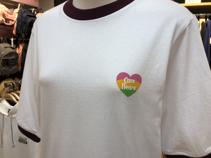 기쁨을 찾게 해주는 케어베어의 메세지를 왼쪽 가슴에