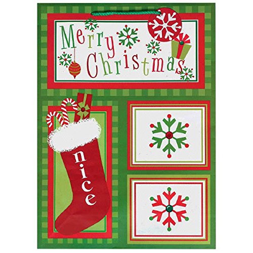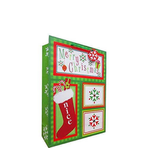 Amscan Christmas Whimsical Stocking Extra Large Vertical Kraft Gift Bag, 18" x 13" x 5", Green/Red