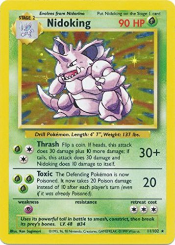 -. Binding : Toy -. Brand : Pokémon -. EAN : 0791932206867 -. Feature : A single individual card from the Pokemon trading and collectible card game (TCG/CCG). / This is of Rare rarity. / From the Base Set set. / You will receive the Holofoil version of this card. -. IsAdultProduct : 0 -. Label : Nintendo -. Manufacturer : Nintendo -. ProductGroup : Toy -. ProductTypeName : TOYS_AND_GAMES -. Publisher : Nintendo -. Studio : Nintendo -. Title : Pokemon - Nidoking (11) - Base Set - Holofoil -. UPC : 791932206867