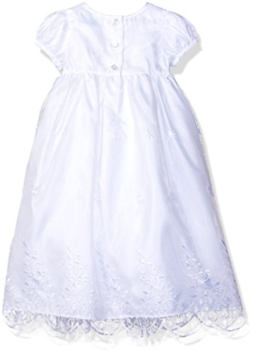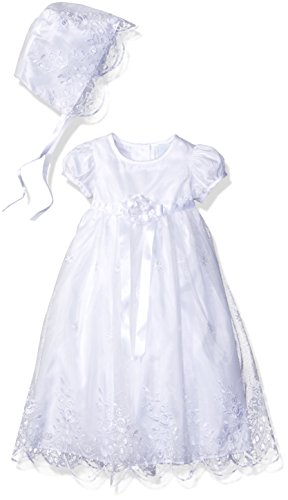 Baby girls christening dress featuring intricate floral scalloped hem embroidered organza fabric with flower and ribbon detail at center waist includes an embroidered bonnet with tie detailFeature