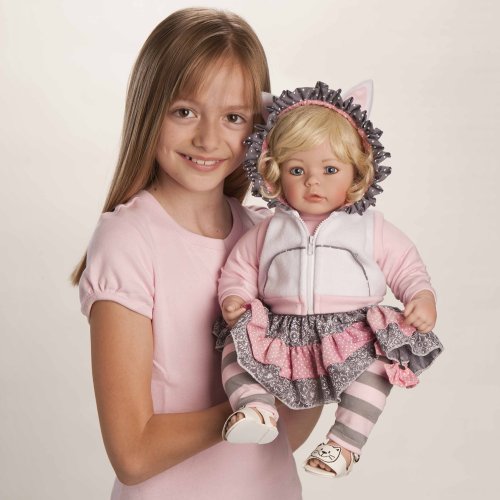- Feature : A cat?s meow in her sporty pink and gray multi-layered leggings, a hooded vest with the kitten ears and a fuzzy cat pocketbook, three ruffle skirt and matching warm pants / Beautiful hand set blue eyes, hand painted details and hand applied eyelashes / Gorgeous light blonde hair with a pink bow accent / Baby powder scented high quality vinyl toddler doll for hours of playtime fun / 20" from head to toe with a weighted body to feel like real baby complete with diaper