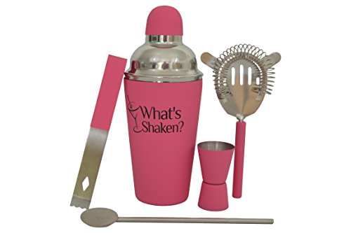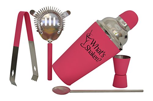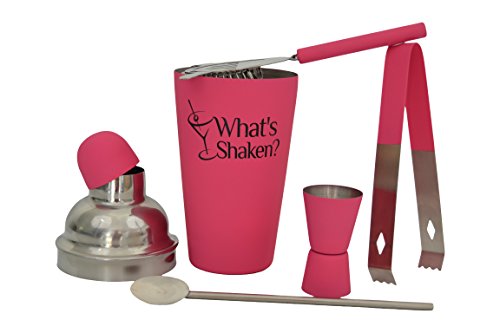 - THE WHAT’S SHAKEN HOME & PROFESSIONAL COCKTAIL SHAKER SET - bundle provides a complete five piece cocktail shaker set - Includes Drink Shaker that is 18 oz. with Built-in Cocktail Strainer and a Bonus Double size jigger that is 1 oz. & ½ oz. also an extra strainer ice tongs and bar spoon ADD TO CART NOW.