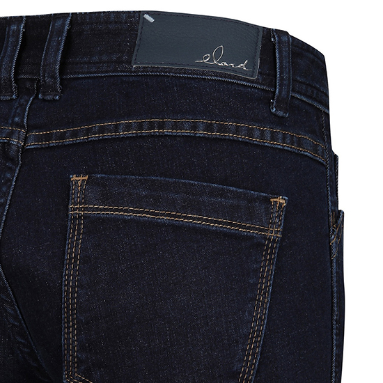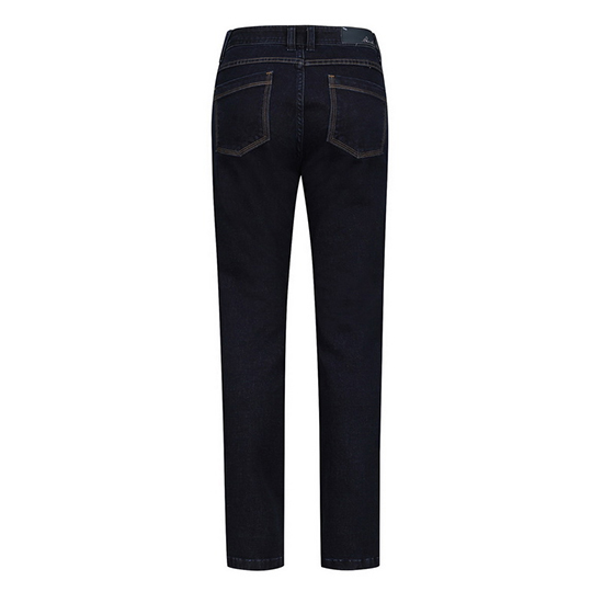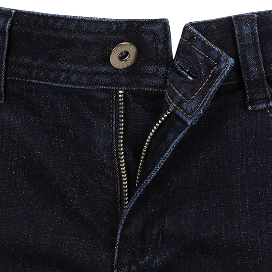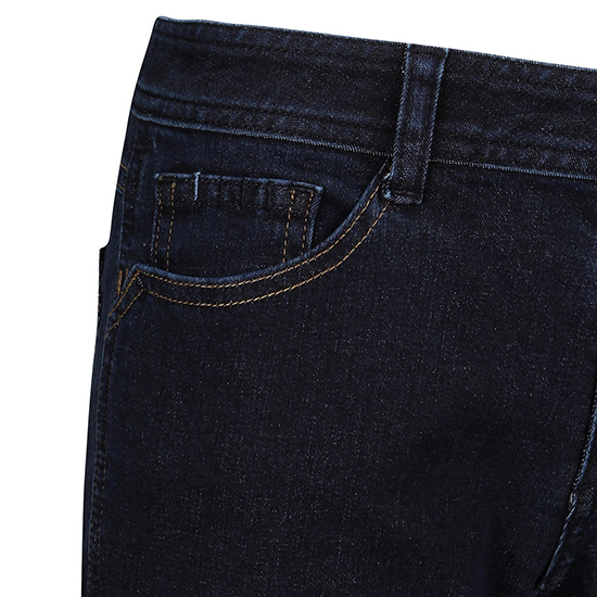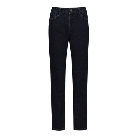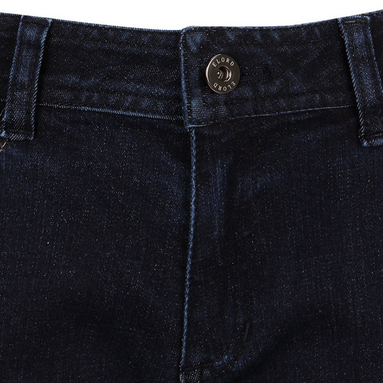 - 다크한 생지 데님 소재를 사용한 여성 팬츠.