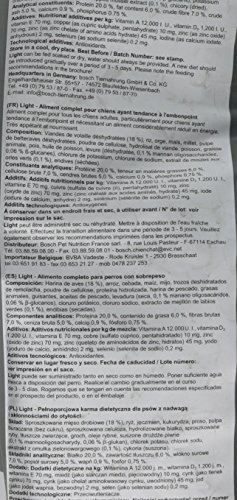 原材料:【原材料】 鶏肉粉(18%)・米・大麦・コーン・キビ・ビートパルプ(糖分除去)・セルロースパウダー・加水分解タンパク質・魚粉・動物性脂肪・エンドウ豆・魚油・酵母(ドライ、マンナンオリゴ糖0.1 %、 ßグルカン0.06 %)・塩化カリウム・ 岩塩・グリーンリップドマッセルエキス(0.1%)・チコリ(ドライ)