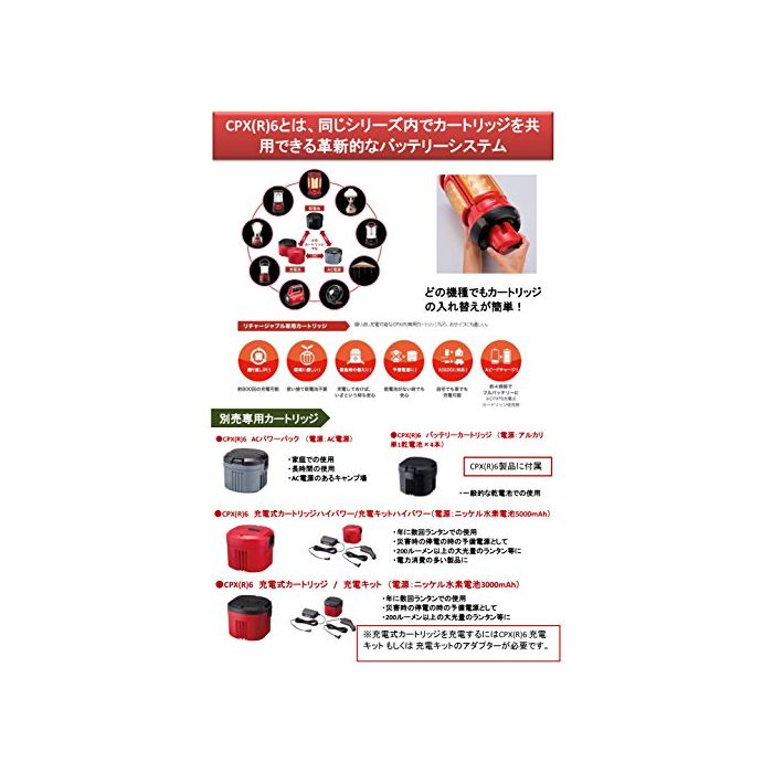 연속 점등 시간:알카리 건전지 사용 시/약27시간(High)고, 약112시간(Low)고, CPX6충전식 카트리지 사용 시/약3시간(High)약10시간(Low)고, CPX6충전식 카트리지 하이 파워 사용 시/약5시간(High)약16시간(Low)고, 분할식 에리어 라이트 사용 시/약2.5시간(High)약5시간(Low)