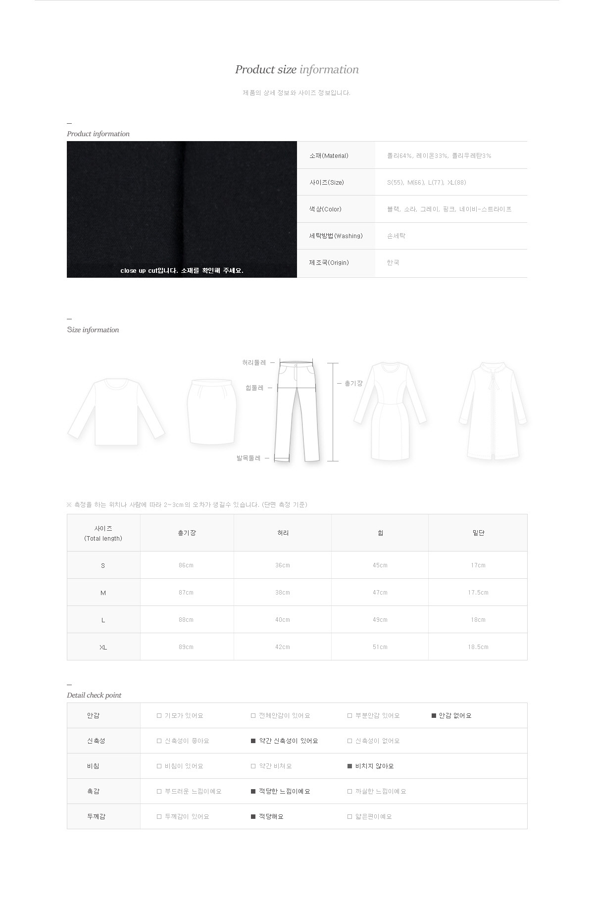 사이즈는 S(55), M(66), L(77), XL(88) 정사이즈로 초이스 해주세요 개인의 체형에 따라 핏이나 기장이 달라질 수 있으니 사이즈표를 참고 해주세요