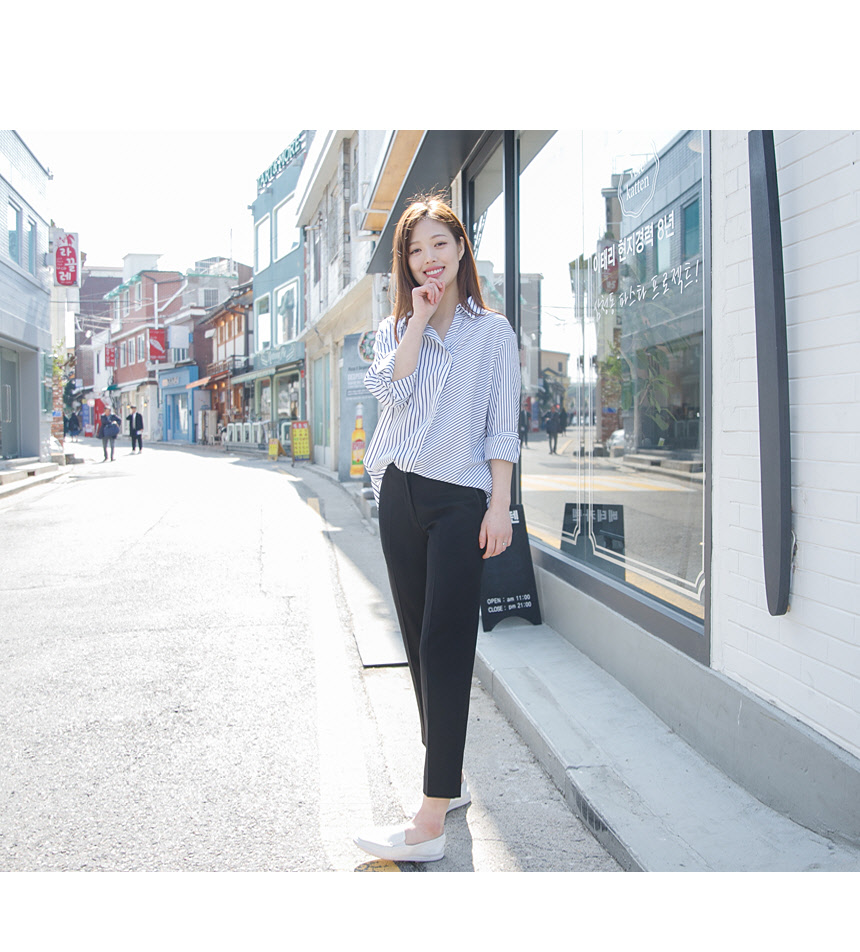 발목 딱 떨어지는 9부 기장으로 키가 작으신 분들도 길이수선 없이 착용 하실 수 있을 거예요~ 셔츠, 블라우스와는 모던룩으로 고급스럽구요 면티, 레이온 티에는 트렌디룩으로 세련되어 보이세요 160cm 기준으로 발목 끝선 정도 오는 길이입니다