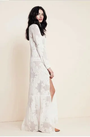 自由奔放に生きる女性2016スリット側レースの白いシフォンマキシドレス春夏新作ラペルビーチロングドレスロングスリーブブラウスシャツ