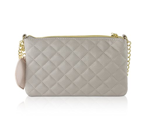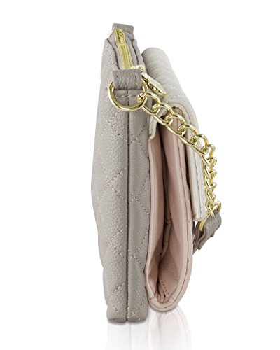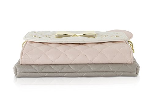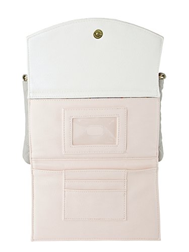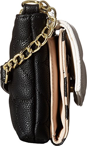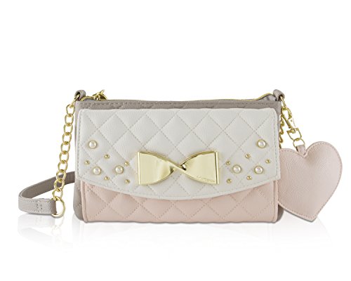 -. Feature : Heart quilted exterior, front stripe logo plate on cream flap, Cheetah P.R.Int pocket / Zip Top main pocket opens tofully lined flower interior, Dangling Black Heart / Front snap flap pocket, 2 bill pockets, 3 card slots, ID window / Holds your credit cards, currency, checkbook and identification / Purse: 8 x 5x 2 Inches (WxHxD), chaind detail cross-body strap 23" drop