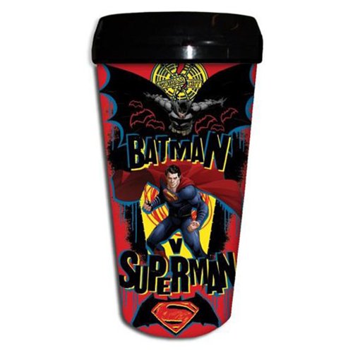 - It's the Caped Crusader against the Man of Steel! This Batman v Superman Dawn of Justice Travel Mug features the two popular superheroes getting ready to duke it out. Holds up to 16 ounces of liquid.