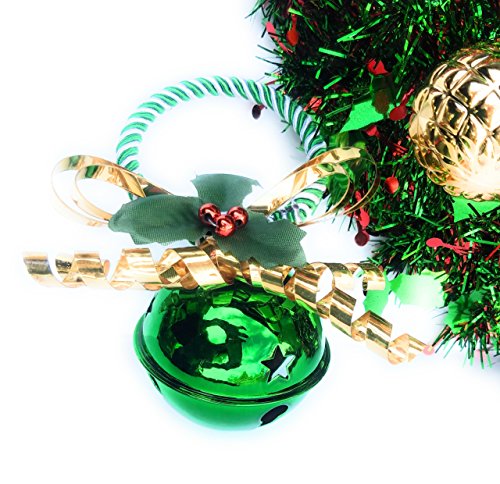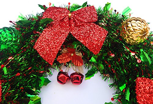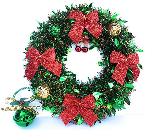 Christmas Wreath and Door Hanger Decorations - Large Green 17" Artificial Foil with Red Crinkle Bows, Green and Gold Bulbs, and red Bells along with Red Door Hanger Bell with Bow