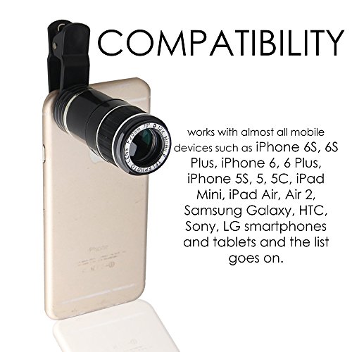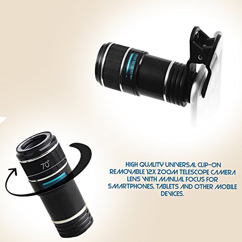 Premium Removable Clip-on Camera Lens with 12X Zoom Manual Focus Telescope for iPhone 6S, 6, Galaxy S6, S5 can turn your mobile phone into an instant Telephoto Camera Lens as easy as one, two, three. It attaches to almost all smartphones using its removable clip so you can take photos and videos like a pro. With its 12X telephoto lens, quality of pictures will increase significantly as it will overcome the shortcoming of smartphones that can only take near-sighted photos.