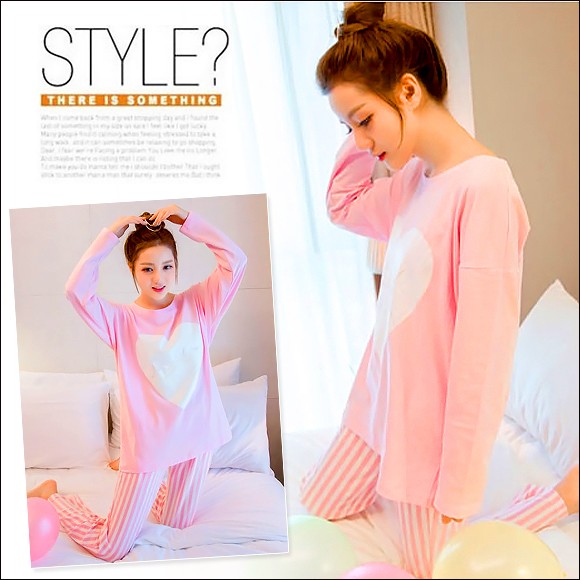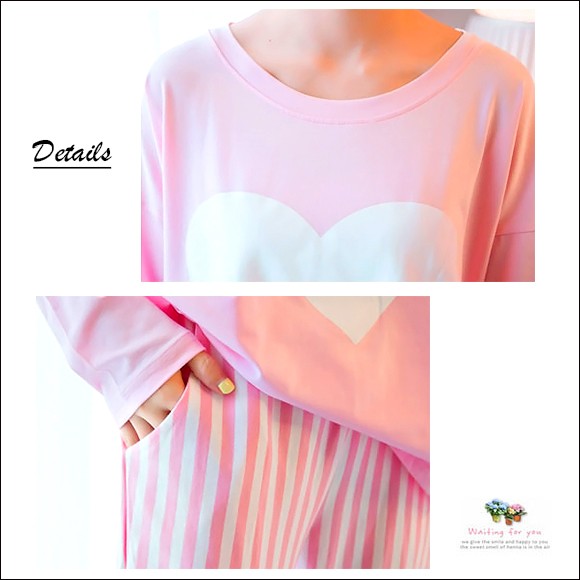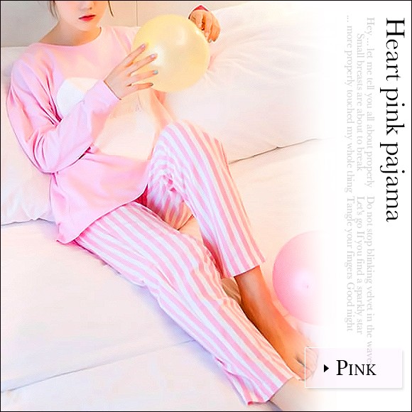 レディース用の長袖パジャマです。ピンクに大きなハートロゴが可愛い♪ズボンはおしゃれなピンクとホワイトのストライプです。リラックスタイムにぴったりのオシャレなパジャマです!【サイズ詳細】M 150-160cm トップス 丈:約52cm バスト:約90-95cm ボトムス 丈:約90cm ウエスト:約60-65cm ヒップ:約85-90cmL 160-165cm トップス 丈:約55cm バスト:約95-100cm ボトムス 丈:約93cm ウエスト:約65-70cm ヒップ:約90-95cmXL 165-170cm トップス 丈:約58cm バスト:約100-105cm ボトムス 丈:約96cm ウエスト:約70-75cm ヒップ:約95-100cm 素材:モダール95% スパンテックス5%