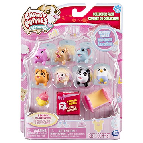 Chubby Puppies are stumbling, fumbling, tumbling cuteness you’ll fall for! Add to your collection or start a new one with Nursery Babies Collector 10-Pack. In this collector pack you’ll receive 7 displayed Chubby Puppy Babies, 2 accessories, and 1 hidden baby in a surprise gift box! Open it up and see who’s inside! Once you’ve assembled your crew of delightful babies, use the two fun accessories included in this set to take care of them. Give each baby a bottle and put them down for a nap in the tiny bed. With over 130 Chubby Puppies to collect, there’s a whole world of cuteness to discover!Feature