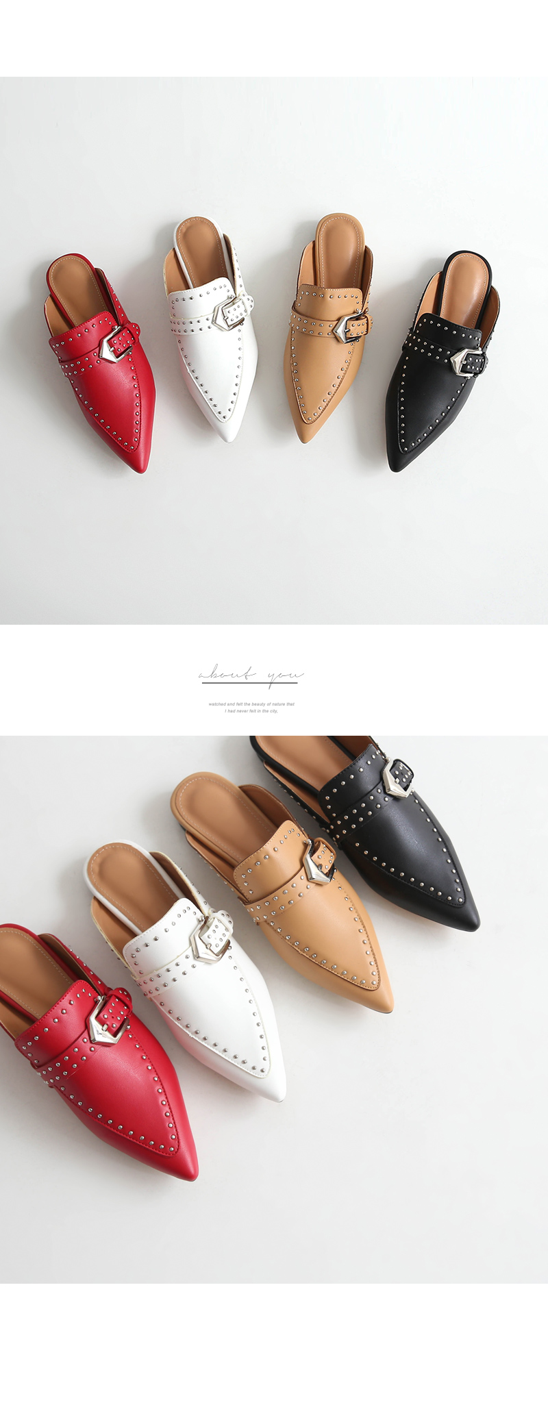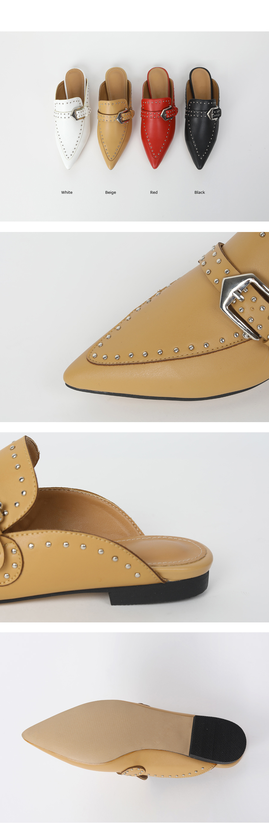 DETAILS - 소재 : 인조소가죽 스터드 - 컬러 : white,beige,red,black - 피팅감 : 정사이즈 / 무게 : 보통인편 - 착화감 : 뒷꿈치 쿠션으로 폭신폭신해요 - 모델피팅 : 230