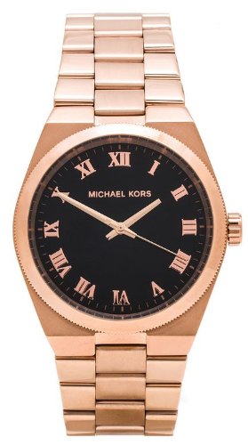 Studio : Michael Kors Publisher : Michael Kors Binding : Watch Product Description Dress watch, Japanese quartz movement, Polished rose-gold-tone hands, Polished rose-gold-tone sweep seconds, Applied polished rose-gold-tone Roman numerals, Rose-gold-tone indices form minute track, Matte black dial with polished rose-gold-tone logo applique, Polished rose-gold-tone stainless steel bracelet with brushed inserts, adjustable links and push-button-clasp, Polished rose-gold-tone stainless steel bezel, Large polished rose-gold-tone stainless steel tonneau (barrel-shape) case, Rose-gold-tone stainless steel crown, Stainless steel screw-down caseback, Mineral crystal, 10 ATM (100 meters/330 feet water resistant) 0