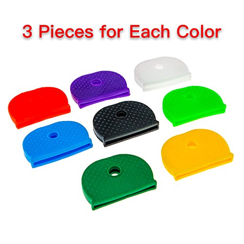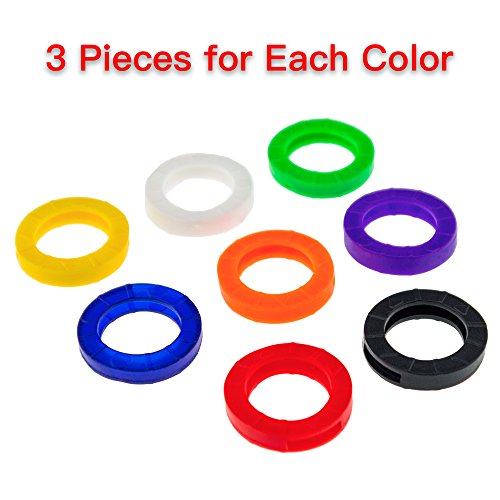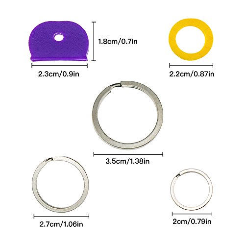 Pack of 48 Key Caps contains assorted colors that may include black, blue, white, green, orange, purple, red and yellow. Also has 10 Pack Different Sizes Key Ring Steel for Keys Organization
