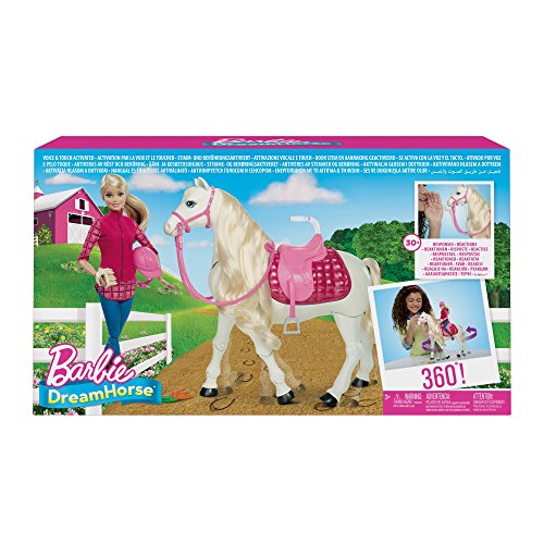 Bring the fun of horseback riding to life and play with Barbie doll like never before with her most interactive horse yet. The Barbie dream horse reacts to touch and sounds -- it features more than 30 realistic reactions! this amazing animal can walk forward, turn 360 degrees and neigh when you play. Dream horse can also feed (a bunch of carrots are included) and nuzzle in response to your touch. For even more fun, dream horse nods Yes or no when you ask a question! it can also play three songs and show off with three different dances. You and Barbie doll can groom the horse's super-long, curly mane and tail with the included brush. And of course, Barbie doll can sit on the saddle -- just use the included waist clip -- to ride along wherever dream horse goes. Barbie doll is ready to ride into your imagination wearing a riding tunic, molded pants, removable boots and a helmet. Her beautiful dream horse matches with a pink saddle and reins. Includes Barbie doll wearing fashions and accessories, interactive horse with saddle and reins, bunch of carrots, brush and helmet. Each sold separately, subject to availability. Doll cannot stand alone. Colors and decorations may vary.Feature