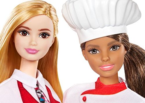 Explore different aspects of related careers with two Barbie career dolls together for double the dreaming fun! Play out restaurant aspirations with the chef and waiter set. The chef wears a white chef’s coat, red pants, black shoes and a white chef’s hat; a pot and ladle help create a signature dish. The waiter doll serves up fun in a white shirt with red apron, black pants and black shoes, a tray with a bowl of soup looks good enough to eat. Colors and decorations may vary.Feature