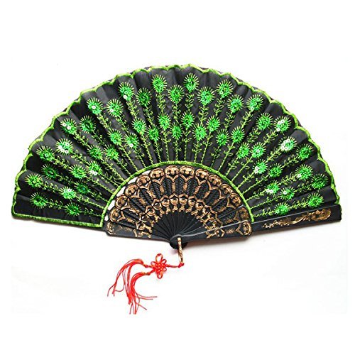 Pixnor Beautiful Peacock Pattern Style Women Lady's Silk Hand Fan Folding Fan with Green Sequins