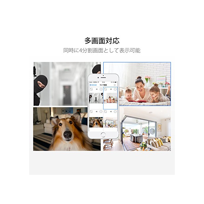 다화면 대응,카메라4대의 화상을《스마호아푸리》화면상에 동시에4분할 화면으로 해 표시에 옵니다.개호,차고,회사나 자택,여행지에서 리얼 타임 영상이 확인 할 수 있습니다,방범이나 애완동물 관찰로도 최적입니다.
