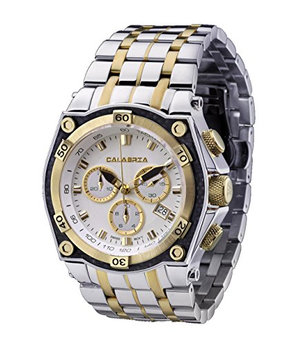 -. Title : CALABRIA - LEVATA - Gold Two Tone Chronograph Men's Watch with Carbon Fiber Bezel and SS Band