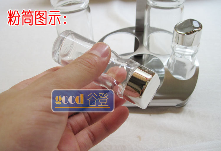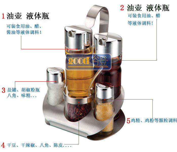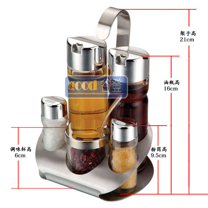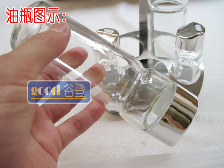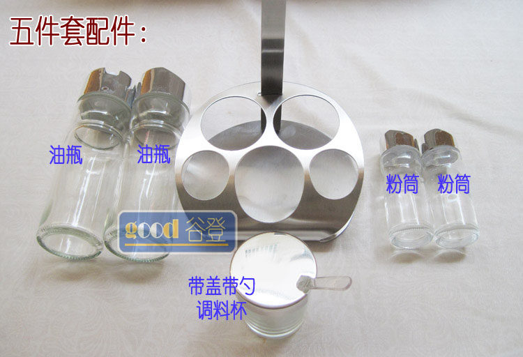 配置:不锈钢底座+2个玻璃油壶、2个玻璃粉筒、1个带盖调料杯