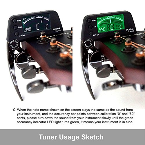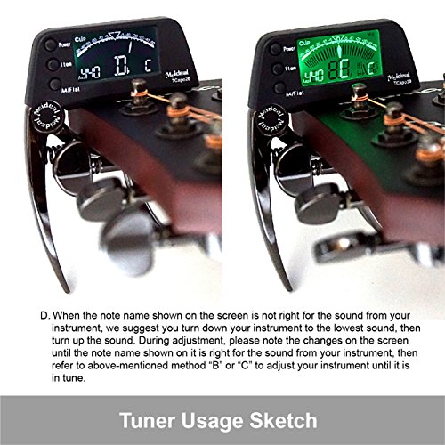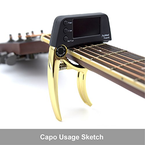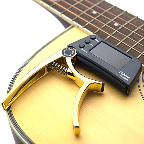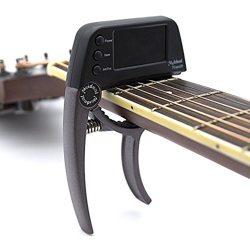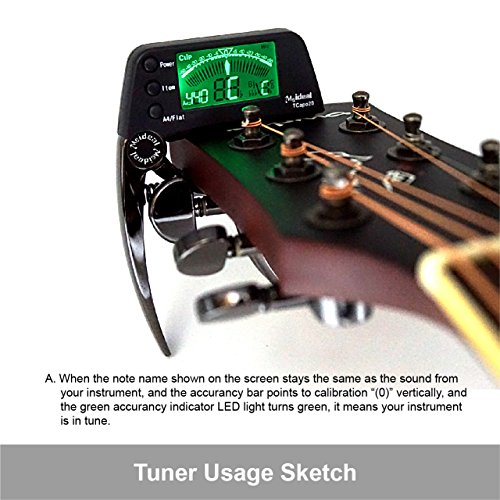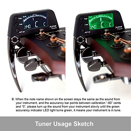 Guitar Tuner-Designed for beginners and professionals. Easy tuning on stage, clip on style. Easily applied and adjusted with one hand. Standard tuning. Drop tuning. Use it with a capo too. Fast and accurate. Easy and intuitive to use.•Guitar Capo Tuner-Combines a capo with a tuner. Stylish Metal Design with a Bright Double Color Display Easy to Read Pretty Accurate Tuning
