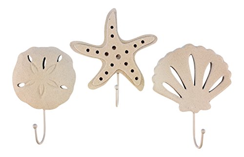 3 Wood Sand Finish Wall Hooks, 1 Scallop Shell, 1 Starfish and 1 Sand Dollar