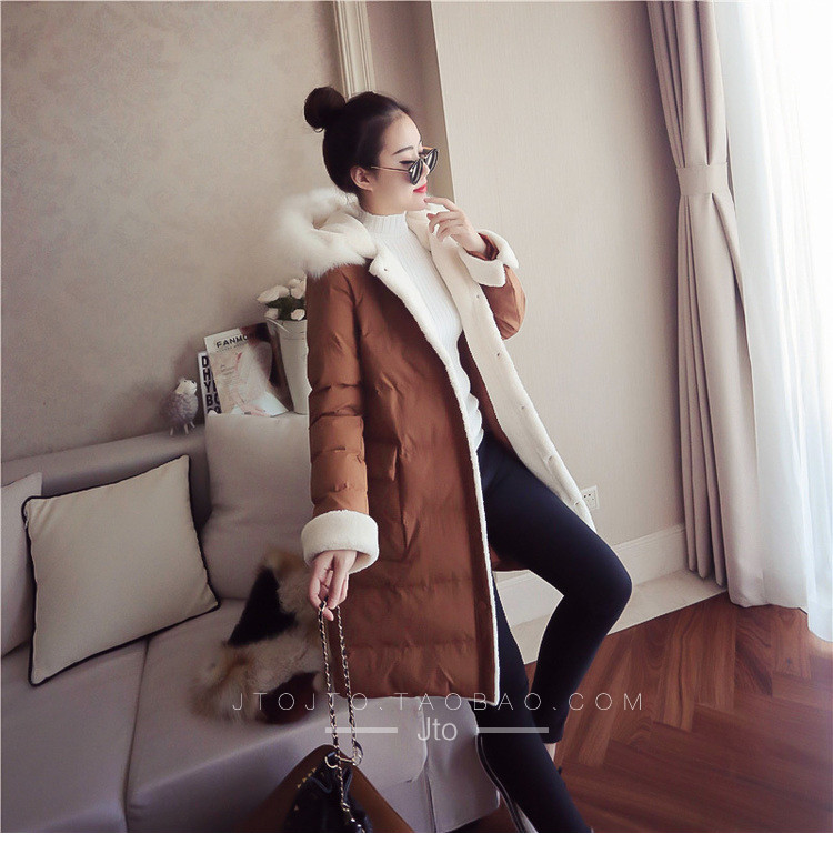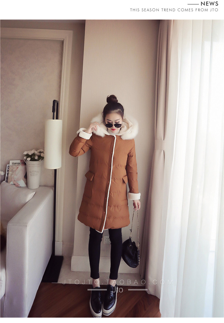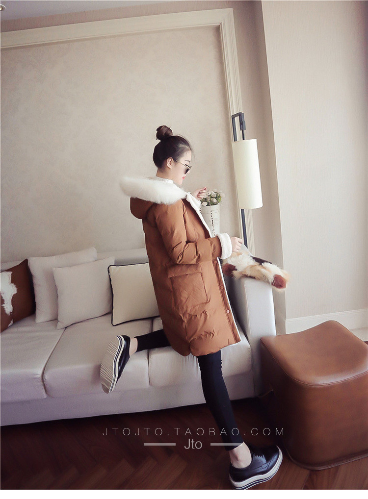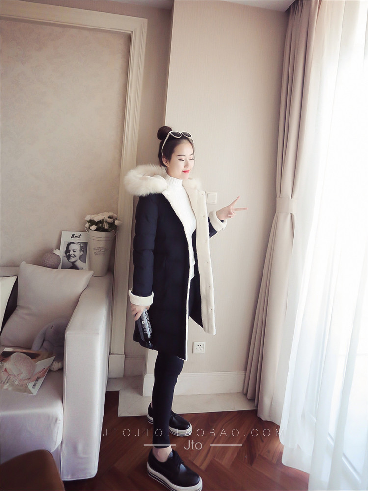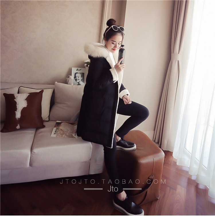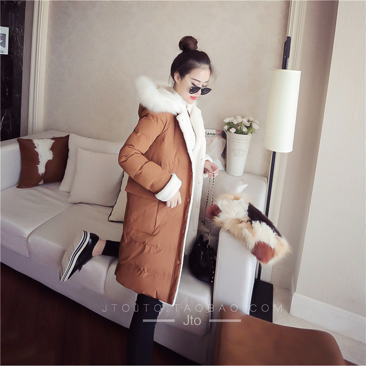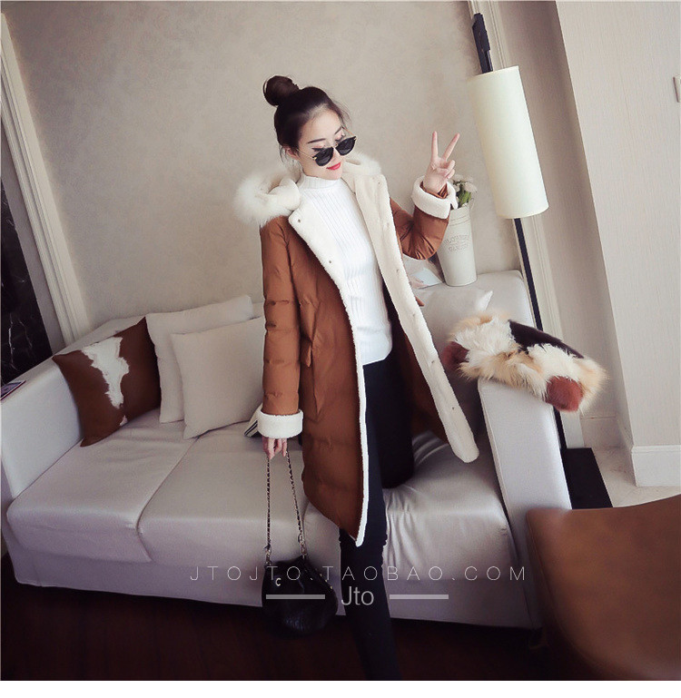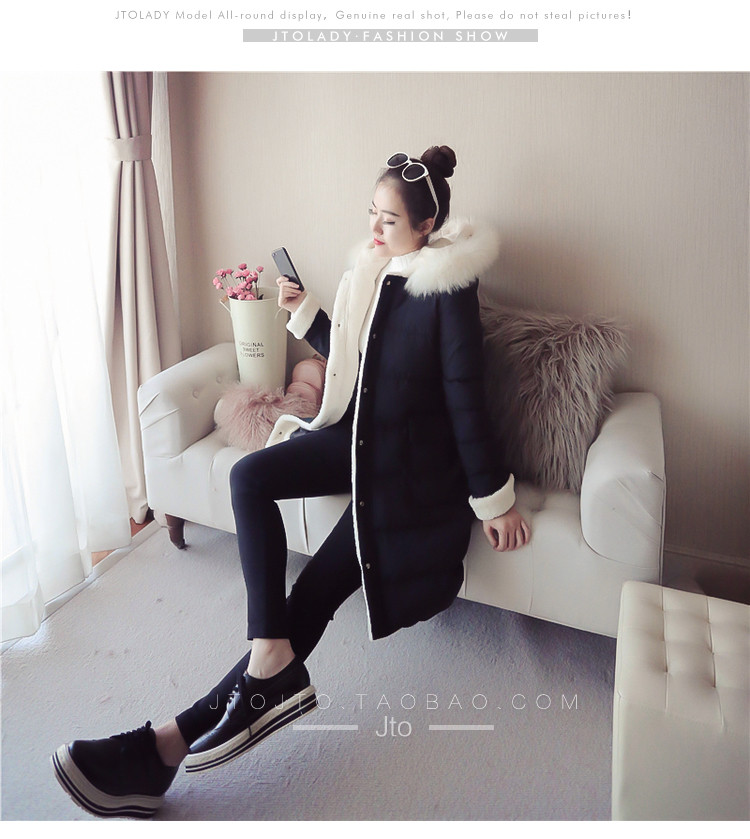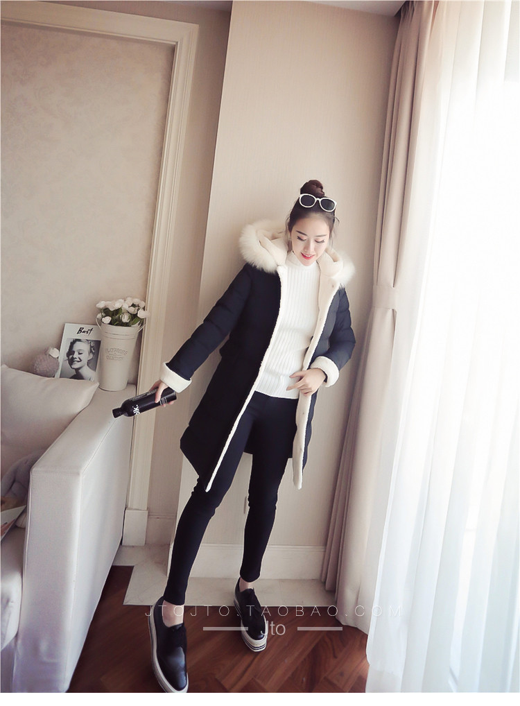 | Name. | 品名 - | 2017冬季新款韩版连帽狐狸毛领中长款棉衣拼接羊羔毛棉服女厚V546 |