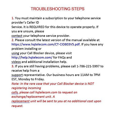 This modern and eco-friendly incoming call block device can block number (s) from annuance callers in the Blacklist (or block number list). Up to 1,500 telephone numbers (up to 16 digits each) can be easily added to Black list memory by simply clicking a button. It also stores 100 incoming calls, and 50 outgoing calls. Besides phone calls, junk faxes can also be blocked to prevent waste of paper. *** Features include: * FSK/DTMF dual system compatible (requires Caller ID service to work properly); * Large storage - Stores up to 1,500 telephone and fax numbers in blacklist memory; * Easy to Use - Simply press a button to store telephone and fax numbers in "Blacklist"; * Works worldwide with any analog phone line, and most VOIP lines (tested on Vonage, Comcast, MagicJack); * Line Powered - It does not require any external power supply or batteries (please ignore battery compartment); * EEPROM technology prevents losing stored numbers when disconnected from the telephone line; * Stores up to 100 sets of income phone numbers and 50 sets outgoing phone numbers; * Blocks telephone numbers with up to 16 digits; * LCD display has 4 levels of brightness; Desk/Wall mountable. ***Applications: This is the ideal solution to increase productivity and privacy in households & workplaces. Stop answering unwanted calls, including call from Telemarketers, Politicians, Junk faxes, Charity/nonprofit organizations, Research companies conducting polls/surveys, Collection agents, banks, lawyers, hospitals, credit cards companies, and many more! ....(U.S. Federal Government sponsored "Do Not Call" registry program does not apply to politicians, non-profit, research organizations). Now shipping the latest Version. Includes free technical support and 1-Year extended warranty (exclusively offered by HQTelecom) which adds accidental damage such as water spills, LCD failures, stuck buttons, and other accidental damages.