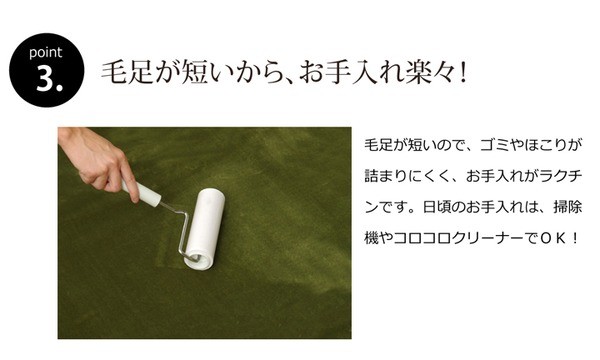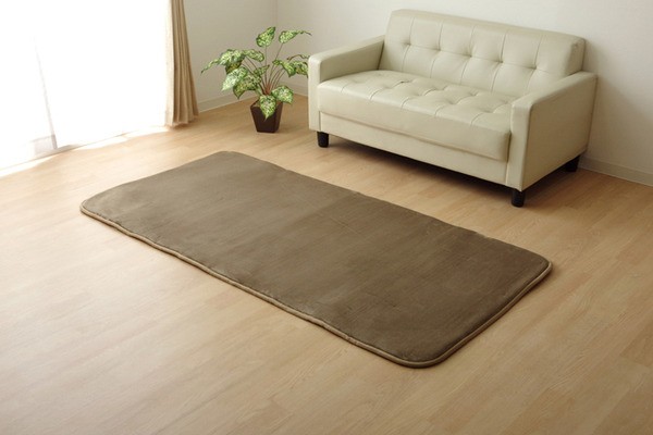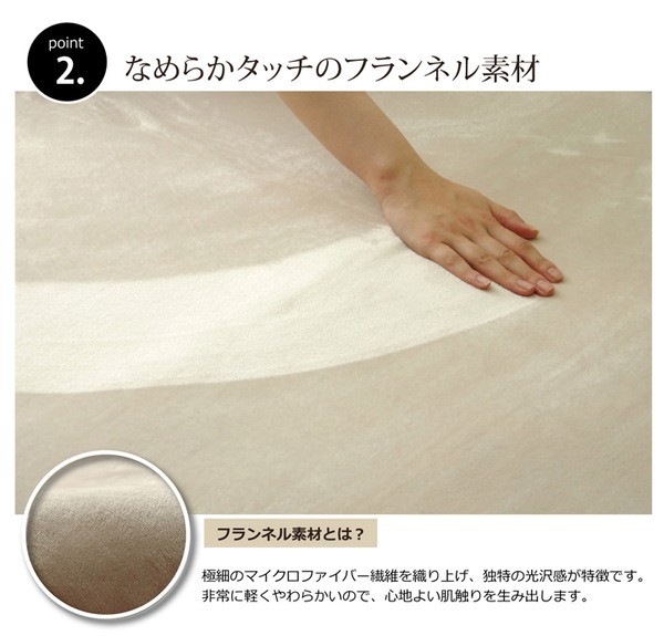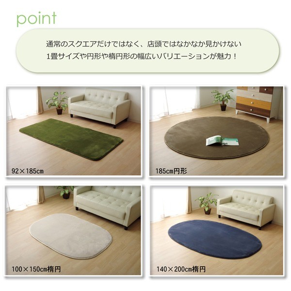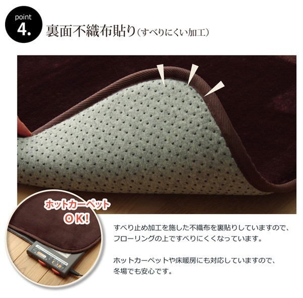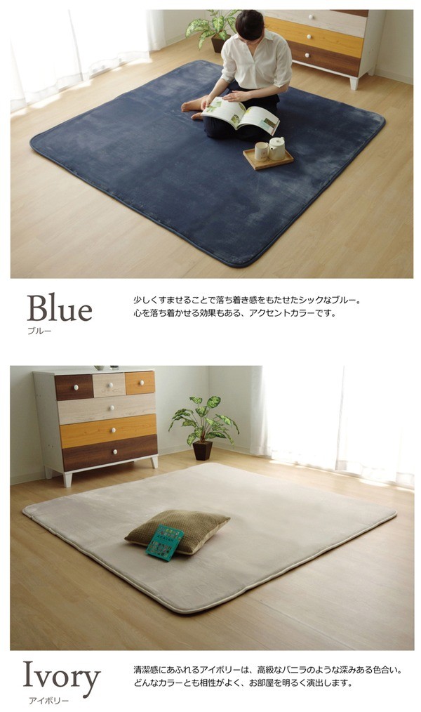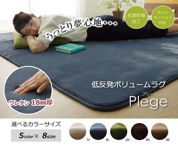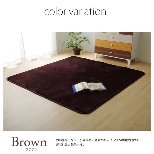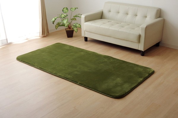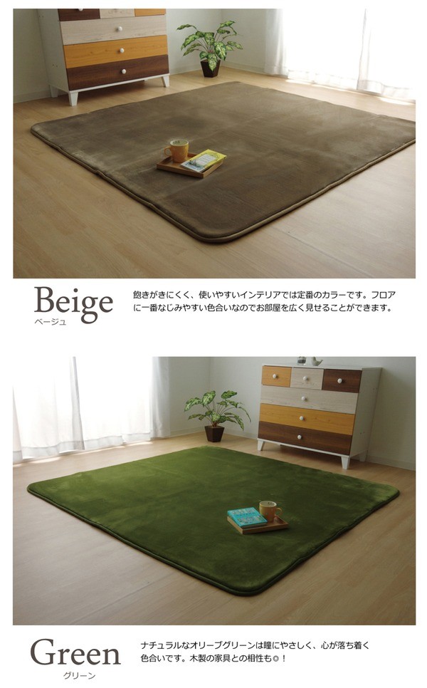 生地に抗菌・防臭加工を施した、ラグカーペットです。多色展開ですので、お部屋に合わせてお好きなカラーをお選び下さい。表地にはフランネルと呼ばれる、しっとりとして非常に柔らかい生地を使用しています。毛足が短いので毛足にゴミが絡みにくく、掃除機をかけやすいのも魅力です。中材には低反発ウレタン18mmを使用しています。プニプニとした柔らかい感触とボリューム感をお楽しみ下さい。フローリングを傷つけにくいよう、裏には不織布を貼っています。また、すべりにくい加工も施しておりますので、部屋を走り回るのが大好きなお子様やペットがいるご家庭にも安心してご使用頂けます。電気カーペットカバーとしてもご使用頂けます。季節を選ばすオールシーズンご使用頂けます。多サイズ展開で、ワンルームから子ども部屋、リビング・ダイニング、ベッドサイド、ソファ前にも。いろいろなシーンに合わせてお選び下さい。