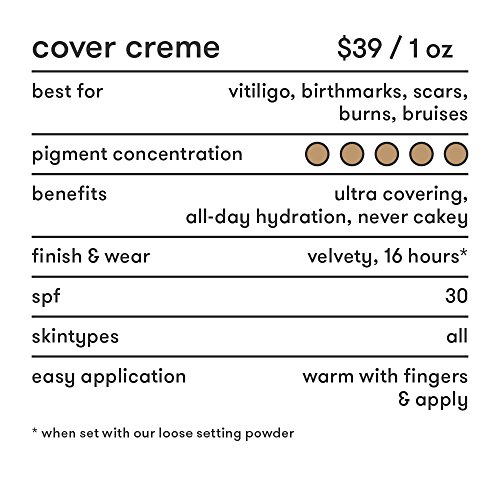 Our best full coverage foundation makeup with SPF 30. Formulated for the most sensitive skin, it provides all-day hydration. Featuring a high concentration of high-performance pigments, this creamy texture is never cakey or masky, providing a natural yet flawless look. Foundation glides on evenly to leave skin feeling fresh, soft and smooth. Versatile makeup foundation formula that can be used as a foundation, a cream concealer and a cream contour. With maximum coverage it can even conceal scars, acne scars, birthmarks, bruising, burns, hyperpigmentation, lupus, vitiligo and post-operative and post-procedure concerns. Provides maximum coverage for up to 16 hours of consistent smudge - and transfer-resistant color wear - when set with Dermablend Setting Powder. Product packaging may vary. Dermatologist tested. allergy tested. non-comedogenic. non-acnegenic. fragrance free. sensitive skin tested. Active ingredient: Titanium Dioxide 3%. Inactive ingredients: Mineral oil, talc, beeswax, isopropyl palmitate, stearyl stearate, kaolin, magnesium carbonate, copernicia cerifera (carnauba) wax, allantoin, microcrystalline wax, lauroyl lysine; may contain titanium dioxide, barium sulfate, iron oxides.Feature