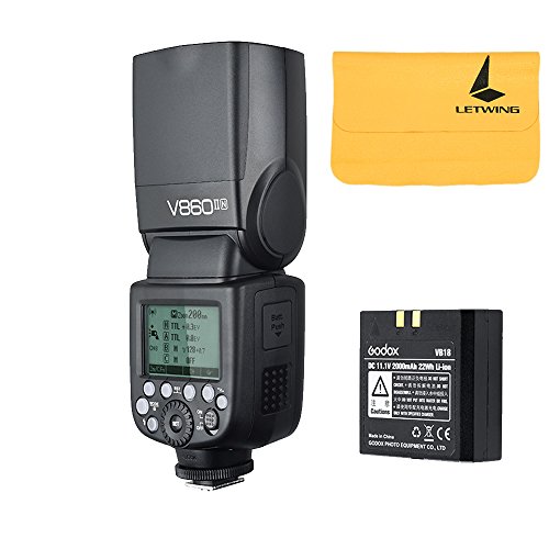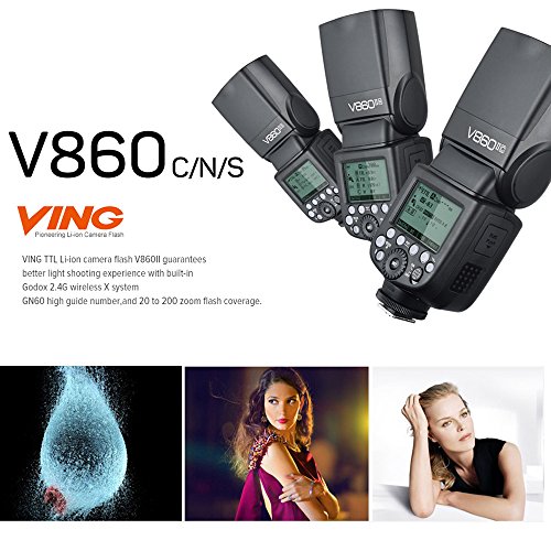 Godox VING TTL Li-on camera flash V860II guarantees better light shooting experience with build-in Godox 2.4G wireless X system, GN60 high guide number, and 20-200 zoom flash coverage