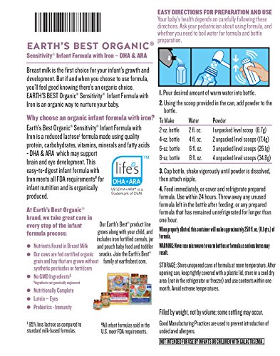Earth's Best Organic Low Lactose Sensitivity Infant Formula with Iron, Omega-3 DHA & Omega-6 ARA, 35.0 Ounce