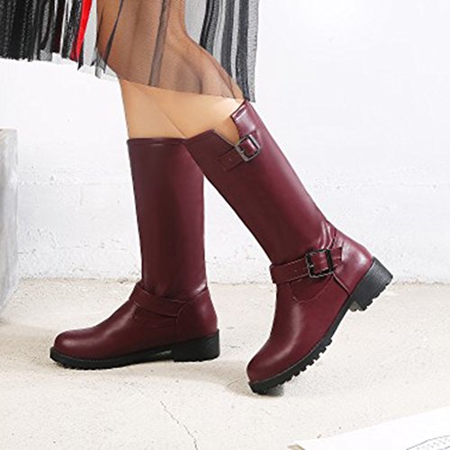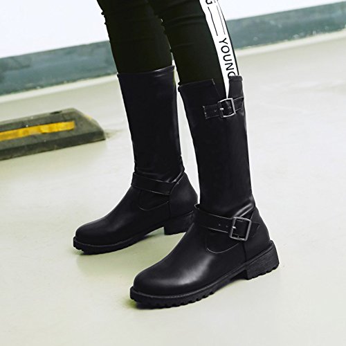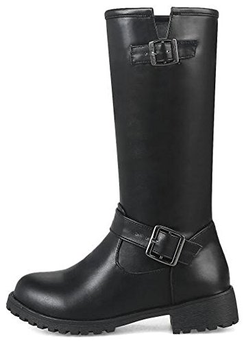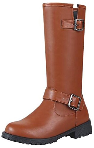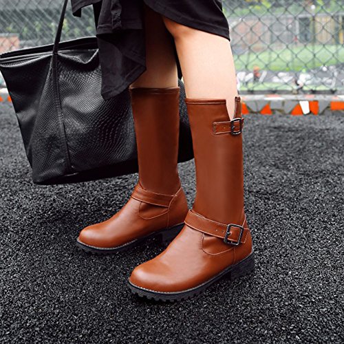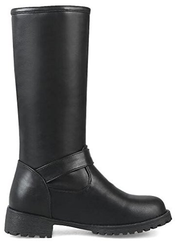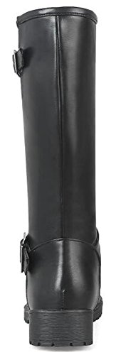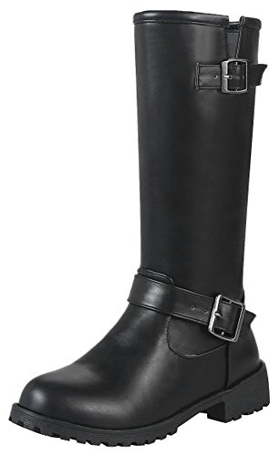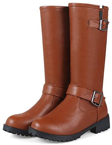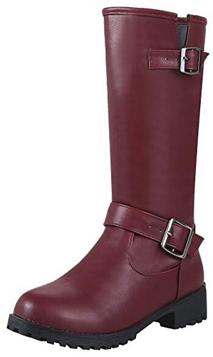 (Mofri)/Women's/Boots/DIRECT FROM USA/Mofri Women's Trendy Buckle Belt Round Toe Block Low Heel Pull On Mid Calf Riding Boots