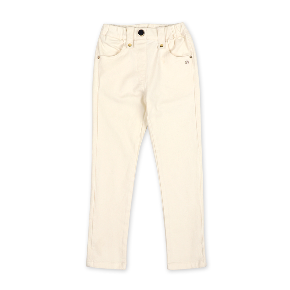 스키니 라인의 아이보리 컬러의 팬츠 입니다. 발목 정도 오는 기장감으로 세련되고 발랄한 여아팬츠 라인을 보여주고 벨벳 단추 처리와 골드 핫픽스 처리로 세련되고 고급스러워 보이는 아이보리 스키니 팬츠 입니다. 어두운 아우터와 함께 코디하면 시크하면서도 세련된 여아 스타일을 보여 줄 수 있습니다.