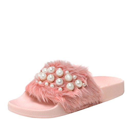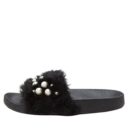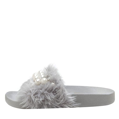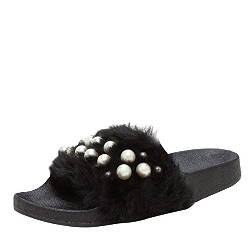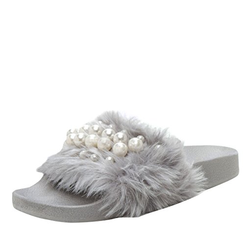 Product Description This furry sandal features a soft faux fur band with multi-size pearly beads accent, open toe, and molded cushioned footbed for comfort 0